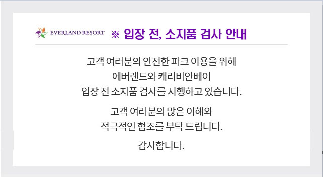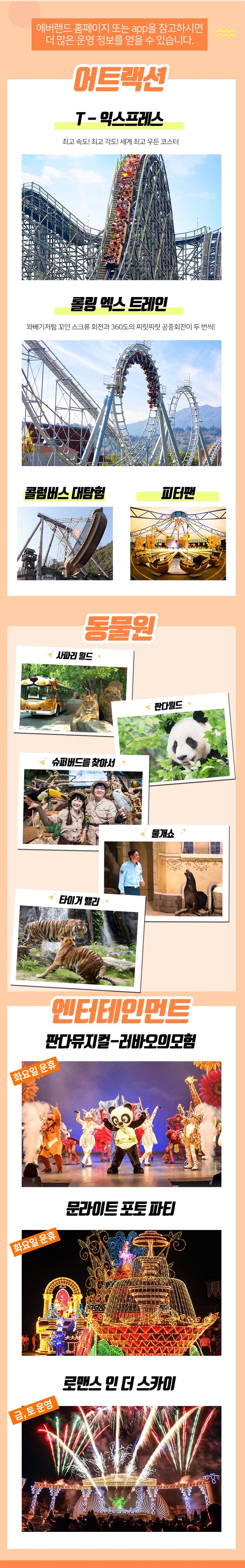 ☞ 기상상황(폭우,혹한) 악화 시, 혹은 파크 사정상 예고없이 어트랙션 운행 및 공연이 중단될 수 있으며 별도 환불금액은 없습니다.