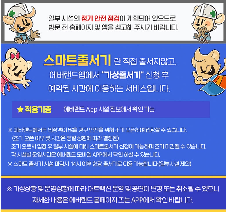 ☞ 에버랜드에서는 손님의 안전을 위해 어트랙션의 안전 점검을 정기적으로 시행하고 있습니다.